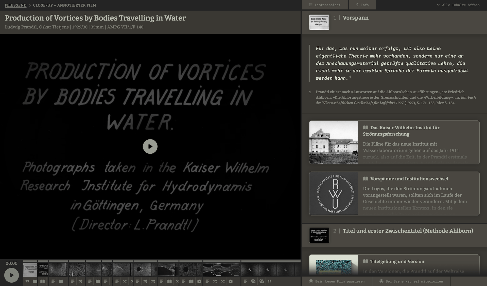Die interaktive Übersicht ermöglicht einen Vergleich der historischen Versionen des Strömungsfilms Entstehung von Wirbeln bei in Wasser bewegten Körpern, sowie einer Auswahl späterer Re-Uses des Filmmaterials. In dieser visuellen Genealogie der Schnittfassungen lässt sich die unterschiedliche Verwendung einzelner Strömungsaufnahmen über die Zeit nachvollziehen.
